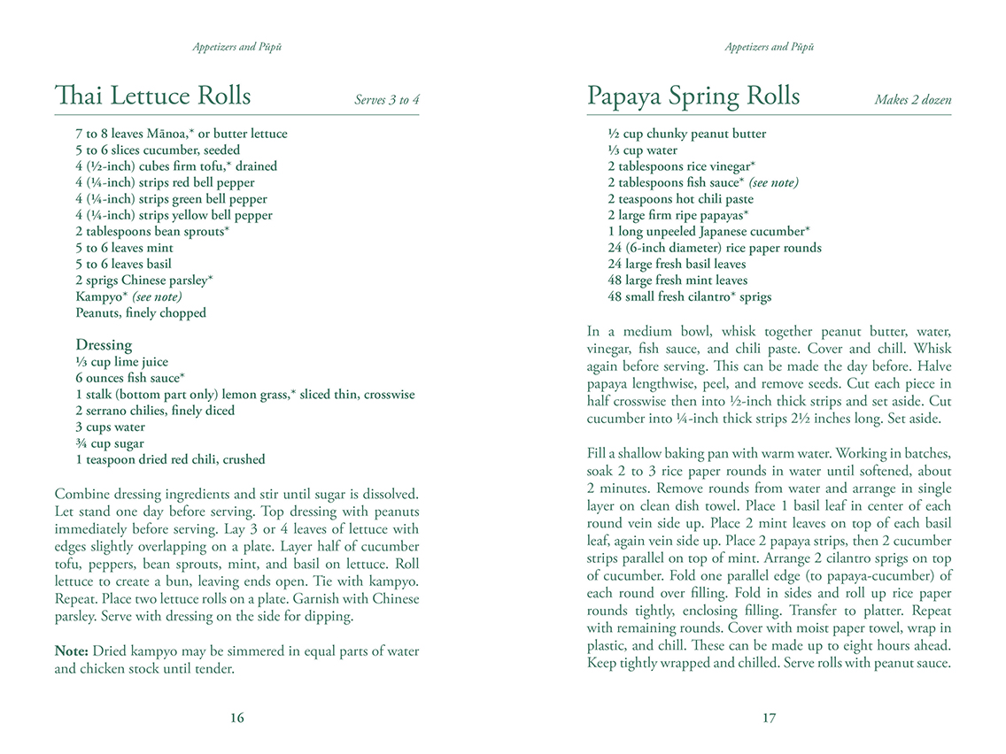 Over 250 recipes to enjoy and cook for your family or guests. The wows will be forthcoming. There are traditional island favorites—lumpia, spring rolls, chicken wings; salads including spinach, Caesar, and papaya; soups like miso, oxtail, and Portuguese bean; entrées range from kalbi, ribs, to lemon chicken and mahimahi. Of course, there’s lu‘au food and an array of desserts featuring island fruits.